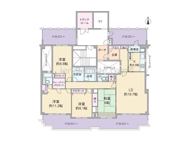 専有面積112.22平米の4LDK。センターインのプランで、4カ所にバルコニー付き。全部屋がバルコニーに面し、明るく、開放感があります。キッチンはカウンタータイプで、洗面室に直接アクセスできるツーウエイ。全部屋6帖以上の広さがあり、LDK...
