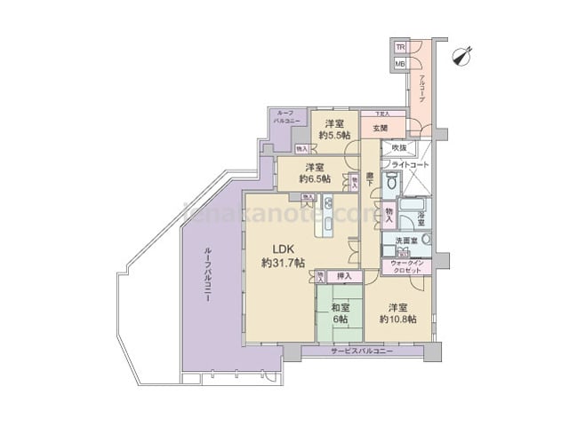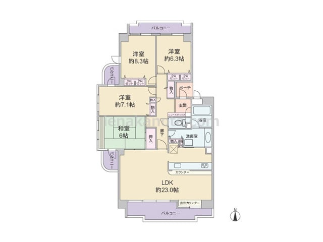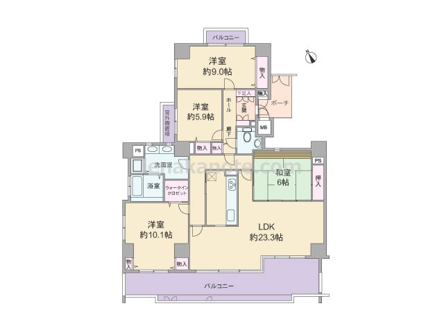 専有面積146.71平米のゆとりの4LDK。共用廊下に直接面する居室が無く、住戸前の廊下を他の人が歩くことが無いため、プライバシーが確保され、共用廊下に面して大容量のトランクルーム(7.10平米)付き。南北両面にバルコニーがあり、出幅もあ...