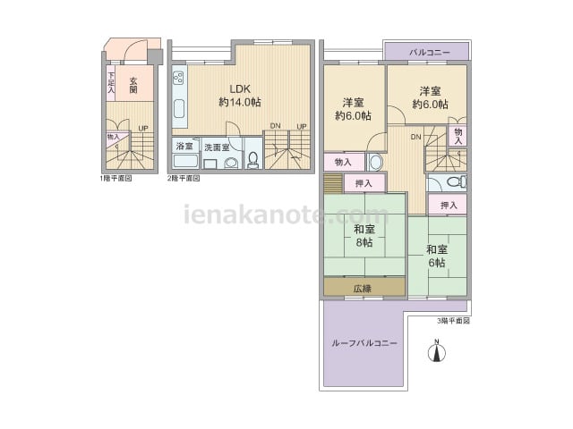 専有面積105.8平米の4LDK。3階建てのメゾネットタイプ。全部屋6帖以上の広さがあり、各部屋に収納スペース付き。3階にはルーフバルコニーにあり、ガーデニングやテーブルセットを出して、くつろぐ事も出来ます。