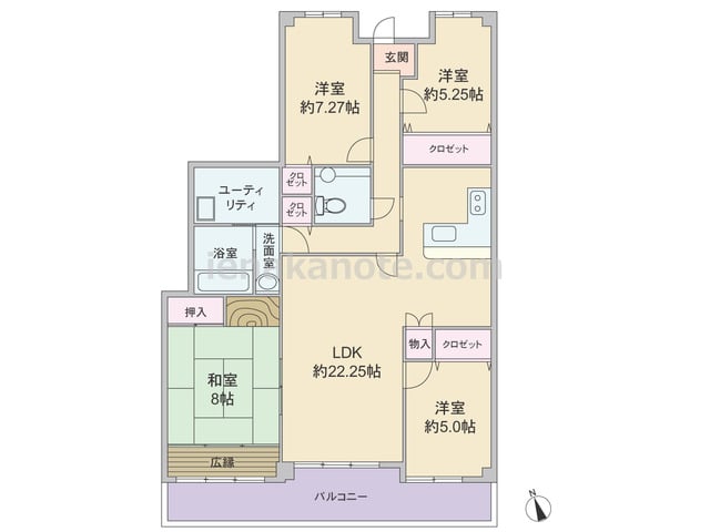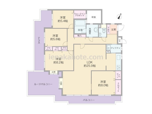 専有面積125.44平米の4LDK。LDKはゆとりの約25.9帖大で明るい2面採光。キッチンは独立型で、すぐ横に便利なユーティリティ付きで、ユーティリティを抜けて、玄関に直接アクセス出来ます。各部屋に収納スペースがあり、洋室約5.4帖にウ...