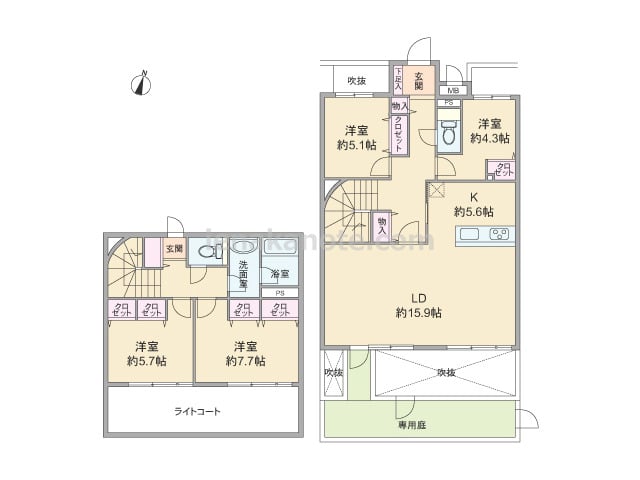 専有面積114.60平米の4LDK。1階・2階の2カ所に玄関があります。LDKは広々21.5帖、キッチンはカウンタータイプ。1階にはライトコート、2階には専用庭があり、ガーデニングスペースや子供の遊び場として使えます。主寝室は7.7帖とゆ...