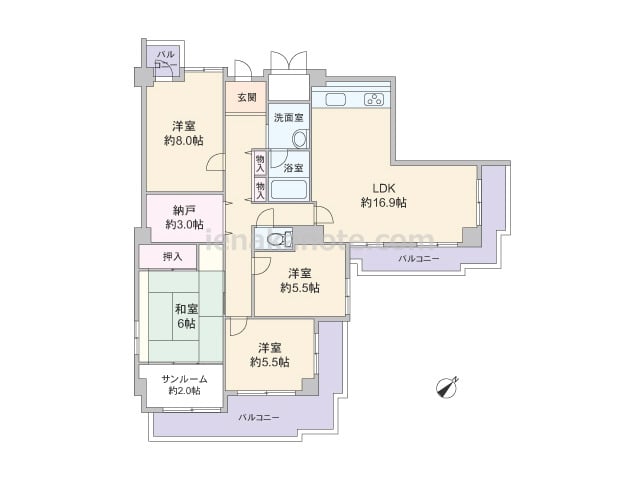 専有面積109.12平米の4SLDK。バルコニーは広々としており、開放的。LDKは16.9帖。各室が独立して配置され、プライバシーが確保されています。約3帖大の納戸があるなど、収納スペースが充実。和室にサンルームが隣接しており、観葉植物置...