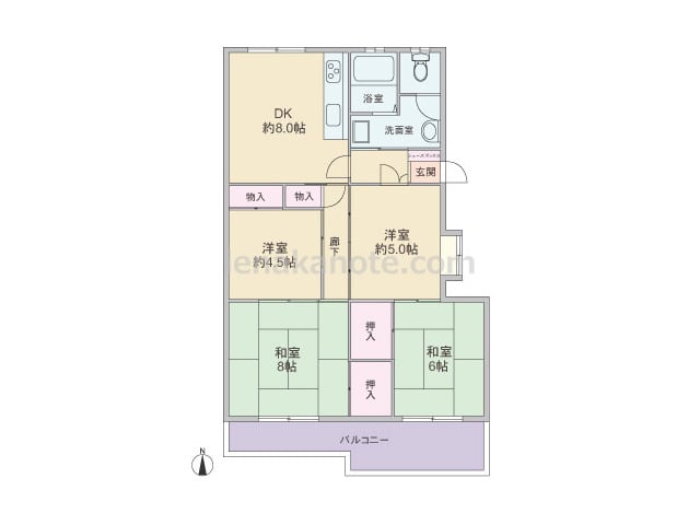 専有面積131.76平米の4LDK。センターイン、ワイドスパンのプランで、玄関前にポーチ、南北両面にバルコニー付き。プライバシーが確保され、明るく、開放感があります。キッチンは独立型で、家事動線にすぐれたツーウエイ。主寝室はゆとりの約10...