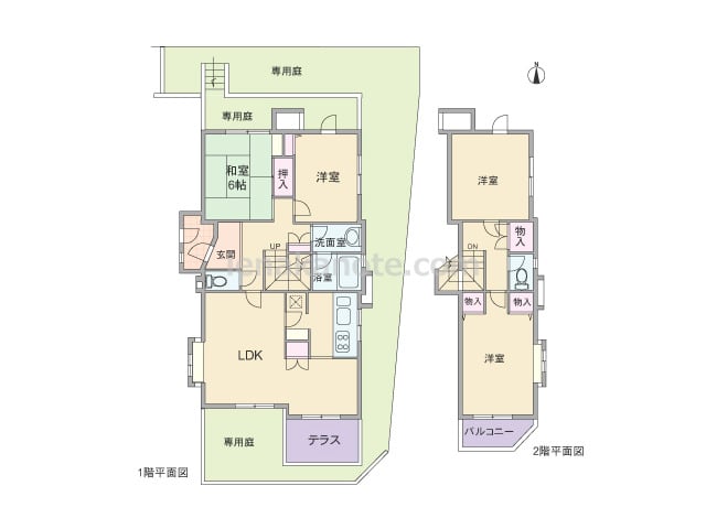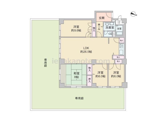 専有面積124.78平米の4LDK。全部屋6帖以上の広さがあり、LDKは約26.5帖大。収納スペースも充実しています。全部屋が広々とした専用庭に面し、専用庭はガーデニングや家庭菜園、子どもの遊び場など様々な楽しみ方が出来ます。