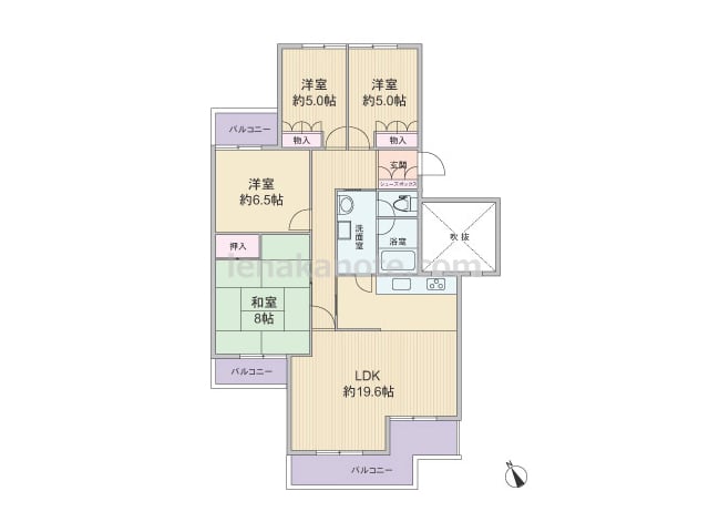 専有面積95.11平米の4LDK。センターインのプランで、3カ所にバルコニー付き。プライバシーが確保され、開放感があります。キッチンは壁付けタイプで、洗面室に直接アクセスでき、家事動線にすぐれています。