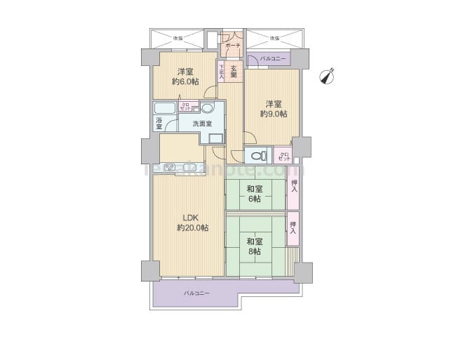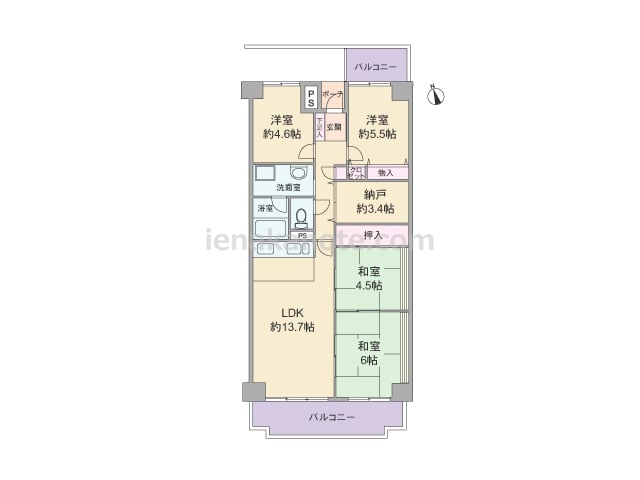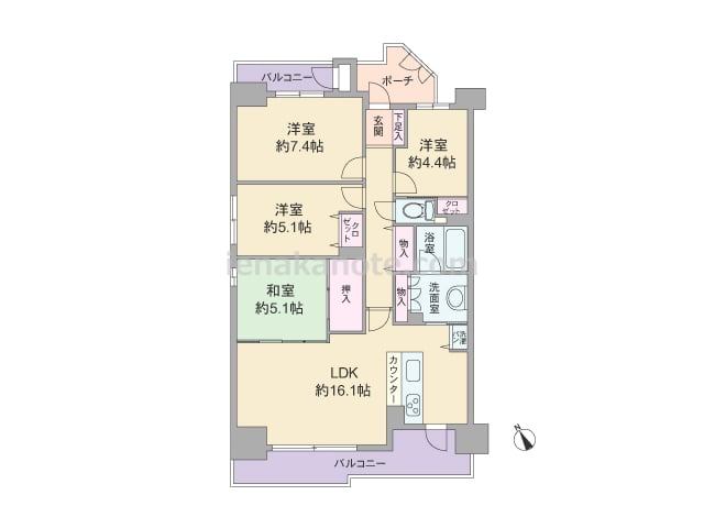 専有面積67.68平米の4DK。センターインのプランで、南北両面にバルコニー付き。キッチン、浴室、トイレにも窓があり、換気がよく快適。続き間が多く、生活シーンに合わせて、フレキシブルに使用可能。収納スペースも豊富です。