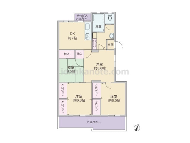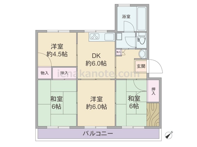 専有面積65.4平米の4DK。南向き・ワイドスパンのプラン。南北両面に窓があり、風通しのよい造りです。どの部屋も続き間になっており、引き戸を開放すれば空間を広々と使う事が出来ます。洋室約6.0帖には収納がありませんが、その他の居室と玄関ホ...