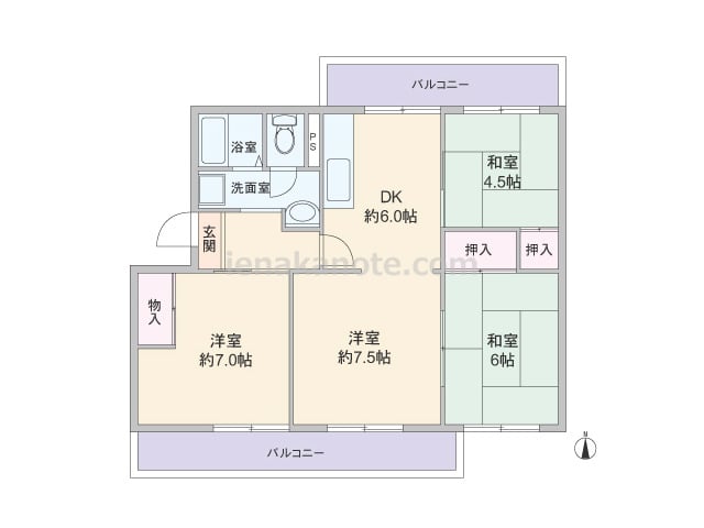 専有面積67.64平米の4DK。南北両面にバルコニー付き。洋室7.5帖はリビングとして使うことができ、南北両側の窓を開ければ、心地の良い風が通ります。7帖洋室を除く全室が続き間となっており、様々なライフシーンに対応可能。引き戸が多く、デッ...