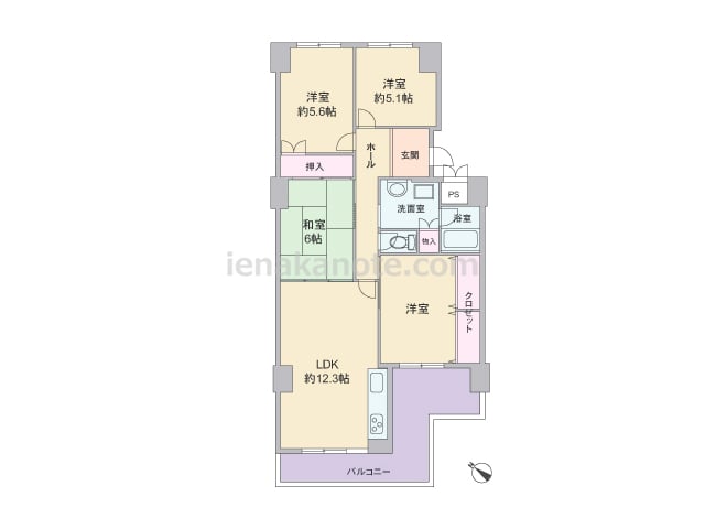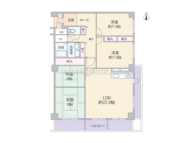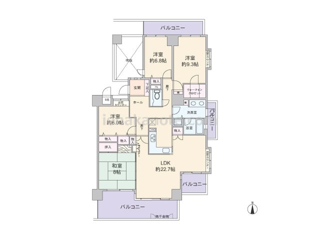 専有面積122.11平米の4LDK。センターインのプランで、3面バルコニー付きのため、共用廊下に直接面する居室が少なくプライバシーに配慮されています。LDKは22.7帖、キッチンは家事効率の良いL字型。リビングに隣接する和室は8帖と広く、...