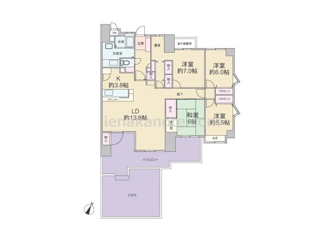 専有面積109.02平米の4SLDK。バルコニーの他、約21平米の専用テラス付きで、ガーデニングスペースや、テーブルなどを出してくつろぎスペースなど、様々なシーンで利用できます。LDが13.8帖、キッチンが3.8帖でLDK合わせて17.6...