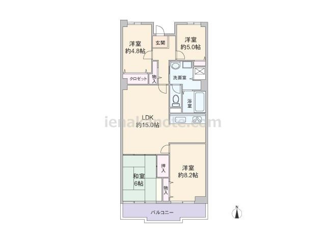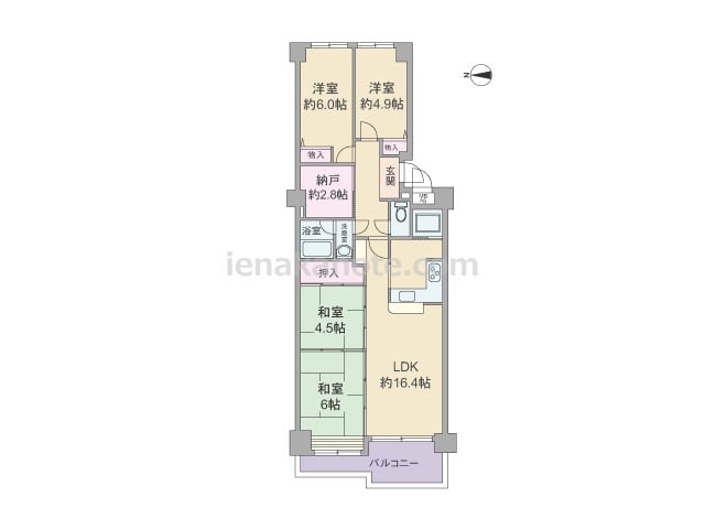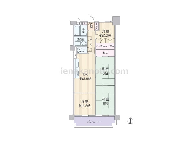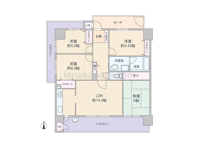 専有面積83.52平米の4LDK。玄関前に大きなポーチがあり、直接共用廊下に面した窓がない、プライバシー性の高いプラン。キッチンは独立タイプで、バルコニーへの勝手口もあります。和室6帖の襖を開放すれば約20.4帖大のLDKとして使う事が可...