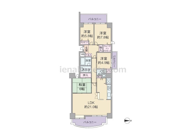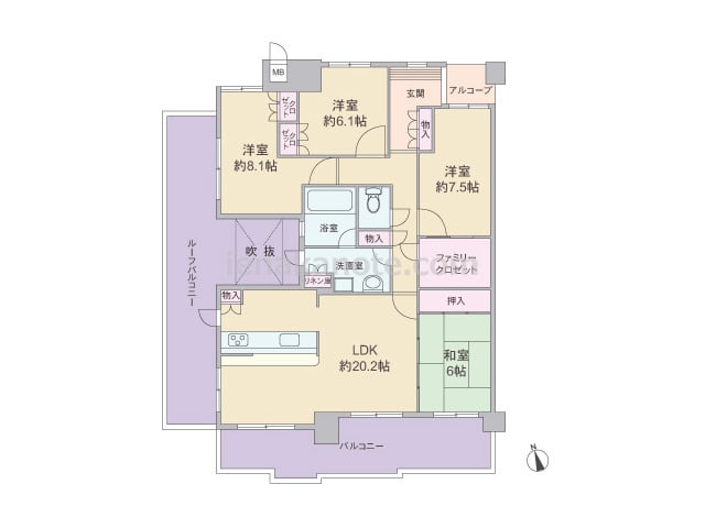 専有面積109.04平米の4LDK。玄関前にアルコーブがあり、室内廊下がクランク状になったプライバシーに配慮されたプラン。全部屋6帖以上の広さがあり、LDKは約20.2帖大。各部屋に収納スペースがあり、約7.5帖の洋室には、廊下からもアク...