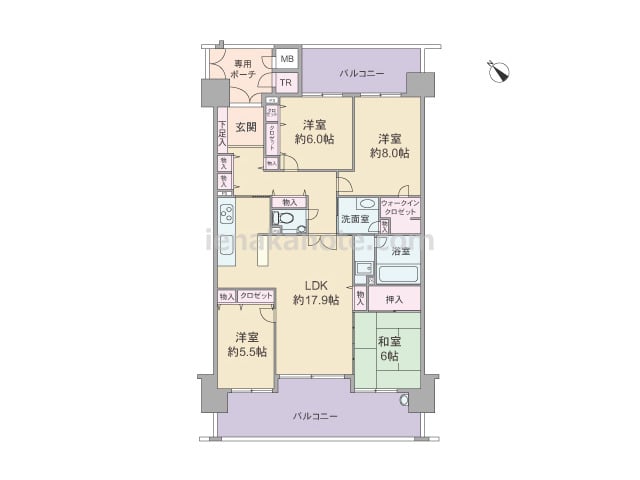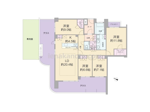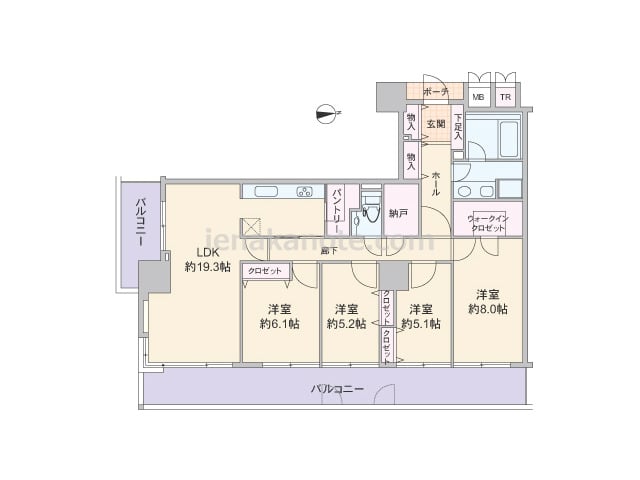 専有面積105.10平米の4LDK。玄関前にポーチがあり、ポーチ内にトランクルーム有り。廊下がクランク状になっており、玄関から室内が見渡せず、プライバシーが確保されています。ワイドスパンのプランで、両面にバルコニー付き。全居室がバルコニー...