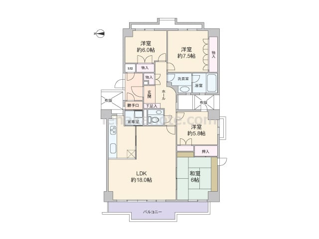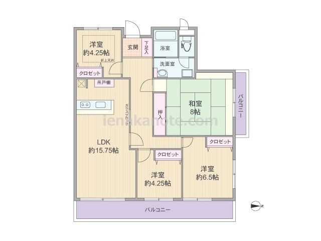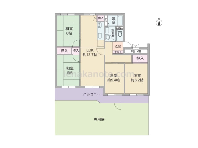 専有面積80.33平米の4LDK。専用庭付き・ワイドスパンのプランで、LDKを含む4部屋が南向き。LDK約13.7帖は南北両面に窓があり、通風にすぐれています。キッチン横には便利な物入付き。和室2部屋はLDKを通って出入りします。洋室約5...