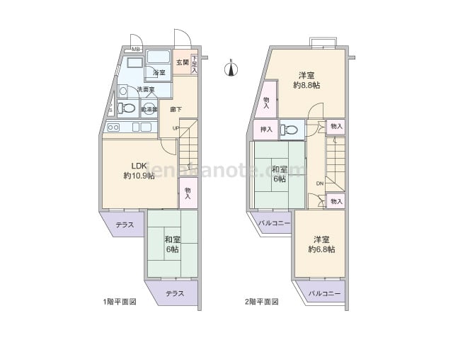 専有面積104.28平米の4LDK。メゾネットタイプで、1階にはテラス、2階にはバルコニーが付いています。水回りはワンフロアに集約されており、家事効率の良いプラン。全室に収納は無いものの、LDKや2階廊下に物入れがあり、収納スペースが豊富...