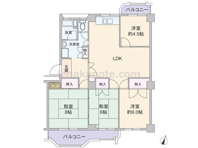 専有面積70.69平米の4DK。二面にバルコニーが付いたセンターインプラン。DK約8.0帖が部屋の中央に位置し、洋室約7.0帖はリビングの利用によさそうです。和室6帖には縁側があります。洋室約4.5帖は仕切りを開放すれば約9.0帖の一室に...