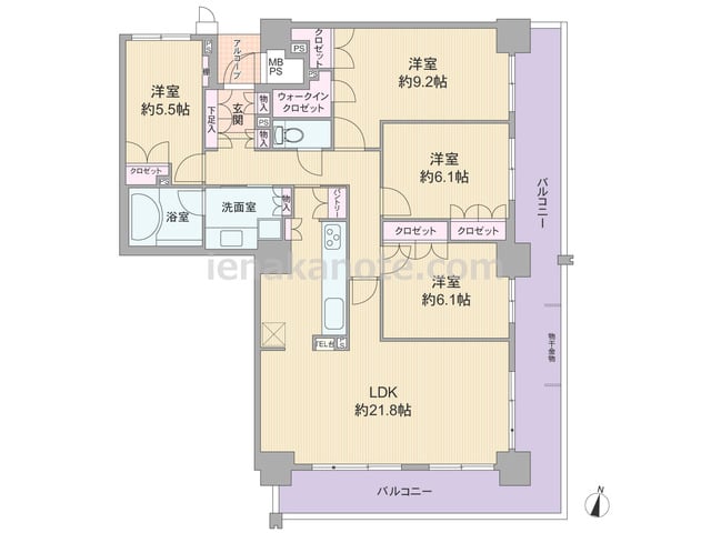 専有面積100.76平米の4LDK。玄関前に専用ポーチがあり、共用廊下に直接面する窓が無い、プライバシー重視のプラン。LDKは約19.7帖の広さがあり、独立型のキッチンはリビング・ダイニングへ生活感が出にくいのが特徴です。和室はLDKと室...