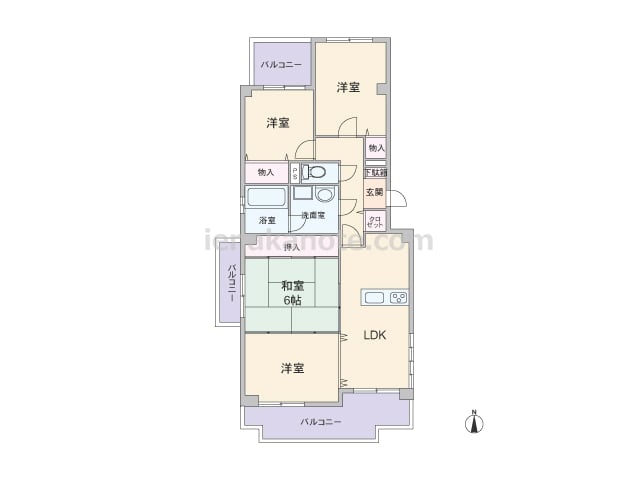 専有面積66.75平米の4K。玄関を入ってすぐにダイニングキッチンがあり、壁付け・オープンタイプのキッチンはダイニングを広く使えるプラン。北側の和室には窓が無いため、家族の個室としてよりも客間にしたり、洋室との間の扉を開放して利用したりと...
