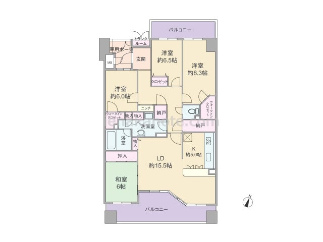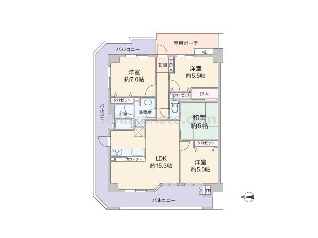 専有面積114.69平米の4LDK。玄関前にプライバシーに配慮された専用ポーチがあり、共用廊下に面してトランクルーム付き。室内廊下もクランク状になっており、玄関から居室を見通す事ができません。玄関から入って正面廊下にニッチがあり、飾り付け...