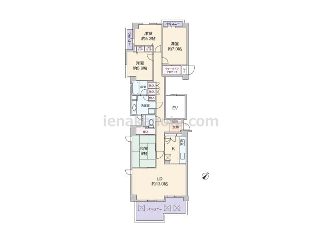 専有面積94.07平米の4LDK。共用廊下に直接面する居室が無く、玄関からリビングが見通せないプライバシーに配慮されたプラン。約19.2帖のLDKには和室が隣接しており、扉を開放してリビングの延長として使用したり、小さいお子様の遊び場スペ...