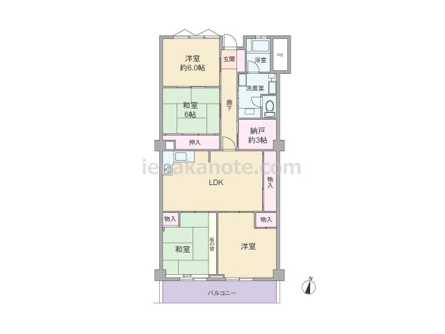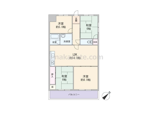 専有面積81.67平米の4LDK。LDKは和室と洋室が続き間で、扉を開放して空間をつなげて使ったり、区切ったりと生活シーンに合わせてフレキシブルに使用出来ます。キッチンは独立型。洗面室からトイレに出入りする配置です。収納スペースが洋室約5...