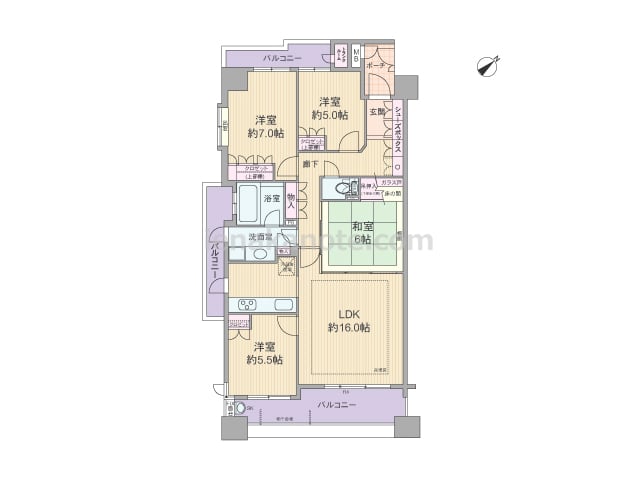 専有面積90平米の4LDK。共用廊下に直接面する居室の窓が無く、玄関前に専用ポーチが付いたプライバシー重視のプラン。LDKはゆとりの約16.0帖大。生活感を感じさせやすいキッチンは独立した配置のため、リビングダイニングはくつろぎの空間を保...