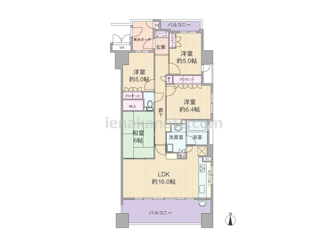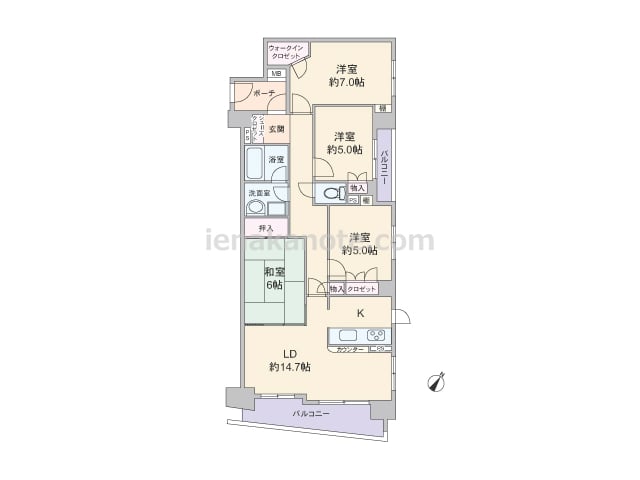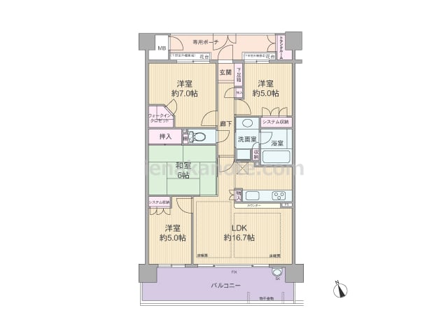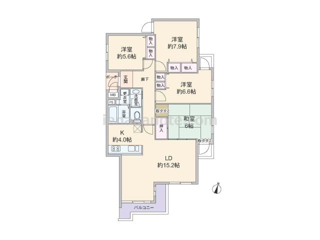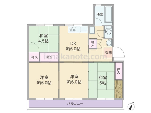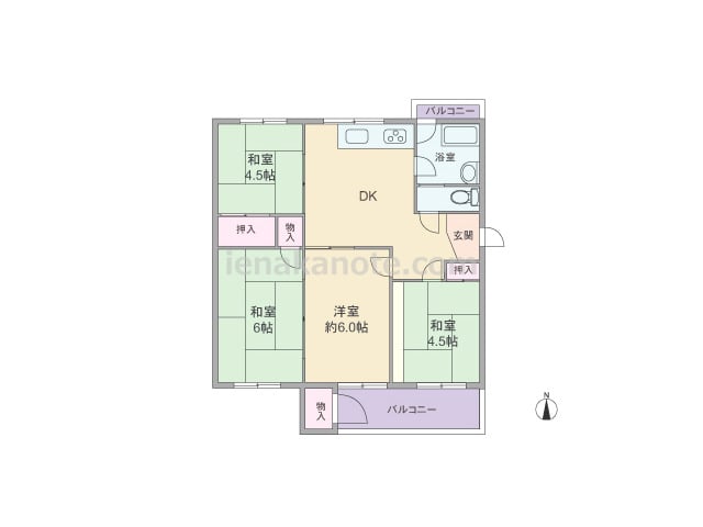専有面積68.66平米の4DK。廊下が短く、居住空間を広く使えるプラン。続き間になっている部屋が多いため、家族間のコミュニケーションが増えそうです。キッチン、浴室にも窓があり、換気がしやすく快適。中央洋室には収納がありませんが、玄関ホール...