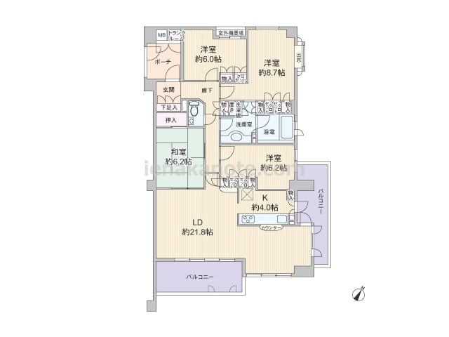 専有面積87.98平米の4LDK。共用廊下に直接面した窓が無く、専用ポーチ付きのプライバシーを確保したプラン。生活感を感じさせやすいキッチンはリビングダイニングから独立しているので、リビングはくつろぎの雰囲気を保つことが出来ます。和室は生...