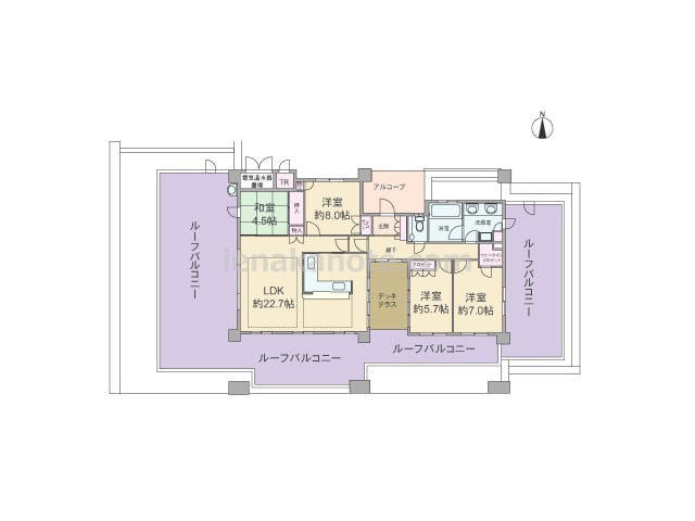 専有面積106.86平米(トランクルーム面積1.21平米を含む)の4LDK。3方がルーフバルコニーに面し、中央部分にはデッキテラスの付いた明るく開放的なプラン。玄関からリビングが見通せないプライバシーに配慮された配置です。リビングは約22...