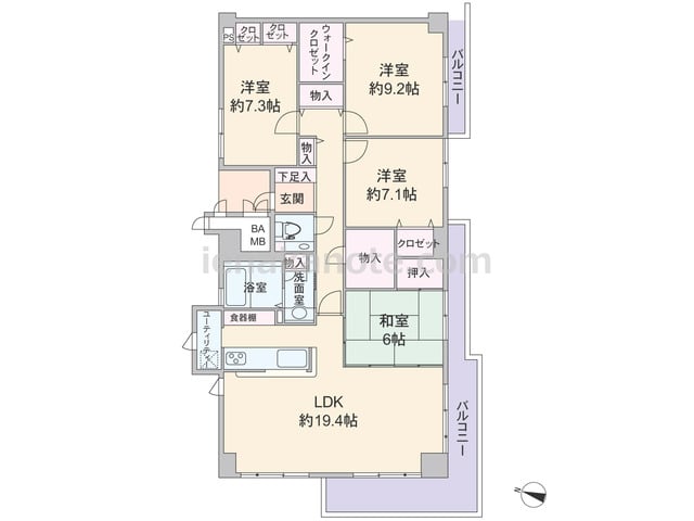 専有面積95.19平米の4LDK。全居室バルコニーに面した、明るく・開放感のあるプラン。共用廊下に直接面する居室の窓が無く、玄関から居室が見通せない配置でプライバシーを確保。玄関は親子扉の仕様です。LDKはゆとりの約15.9帖大。カウンタ...