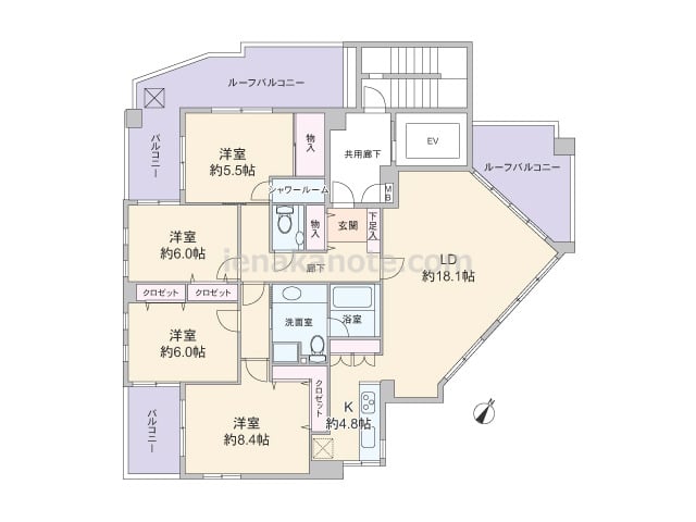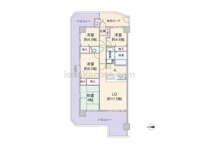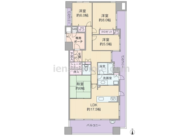 専有面積104.9平米の4LDK。共用廊下に直接面した窓が無く、玄関前に門扉付きの専用ポーチが付いたプライバシー重視のプラン。玄関横にシューズインクロゼットがあり、室内廊下には吹抜けに面したバルコニーがあります。キッチンは家事をしながら家...