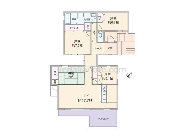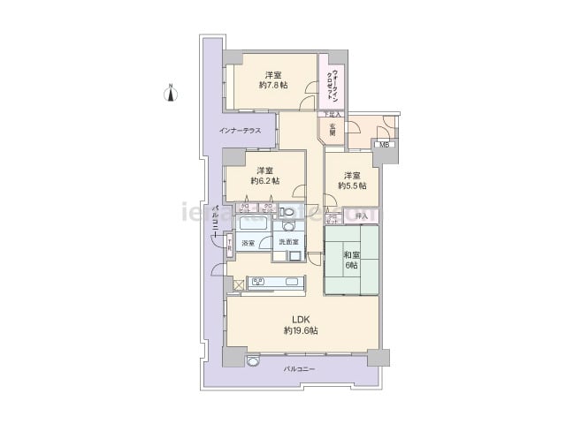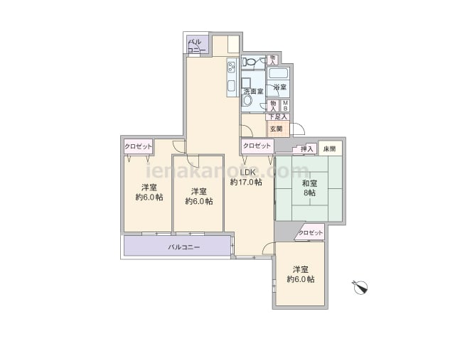 専有面積96.04平米の4LDK。共用廊下に直接面する居室が無くプライバシーを確保。全室6帖以上あり、どの部屋もLDKを通って出入りする家族のコミュニケーションが増えるプラン。キッチンはI型の壁付け・オープンタイプで、北東にあるミニバルコ...