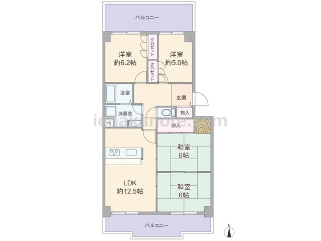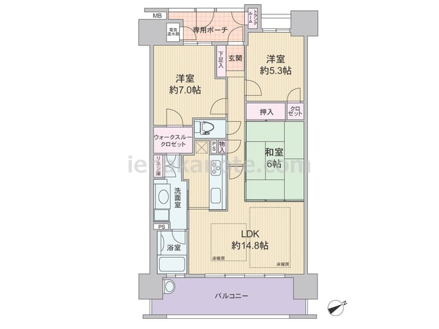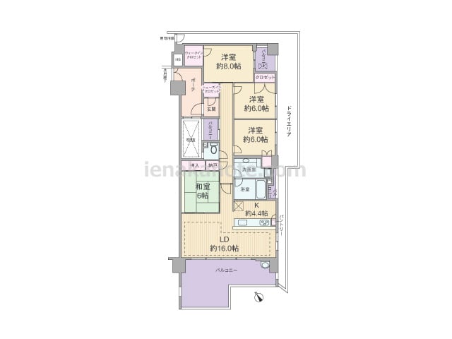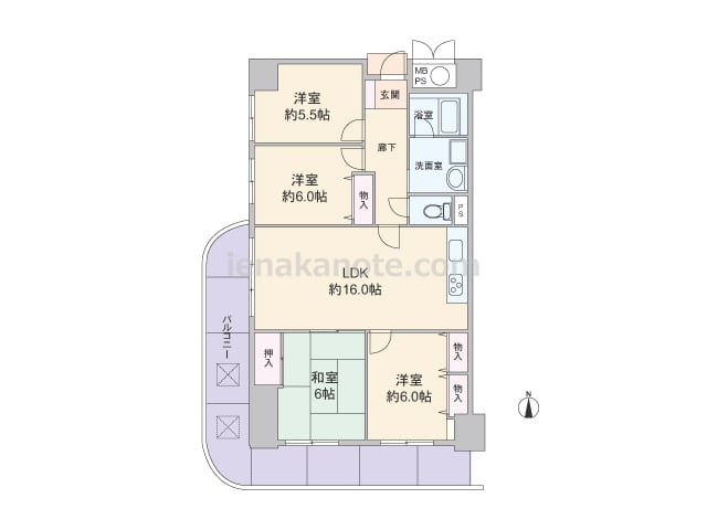 専有面積91.41平米の4LDK。共用廊下に直接面する住居の窓が無く、プライバシーが確保されています。LDKは広々約16.0帖大、壁付け・オープンタイプのキッチンはリビングダイニングを広く使える配置。南側の和室6帖と洋室約6.0帖にはリビ...