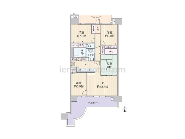 専有面積91.13平米の4LDK。玄関と居室の前にアルコーブがあるプラン。リビングダイニングは約13.4帖、和室6帖の襖を開放すれば約19.4帖大の一室としても使えます。キッチンは作業をしながら家族の様子を伺えるカウンタータイプ。洋室約5...