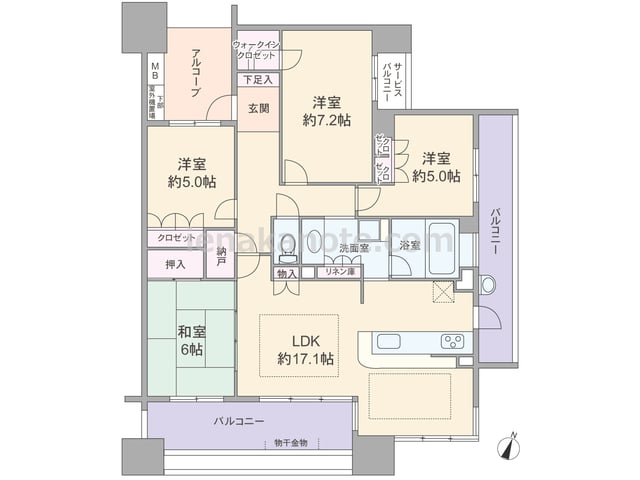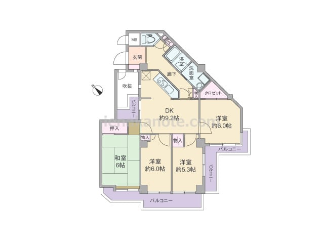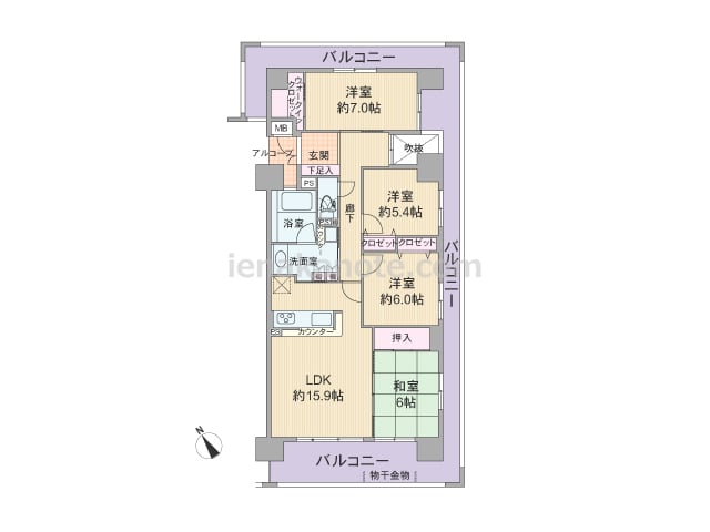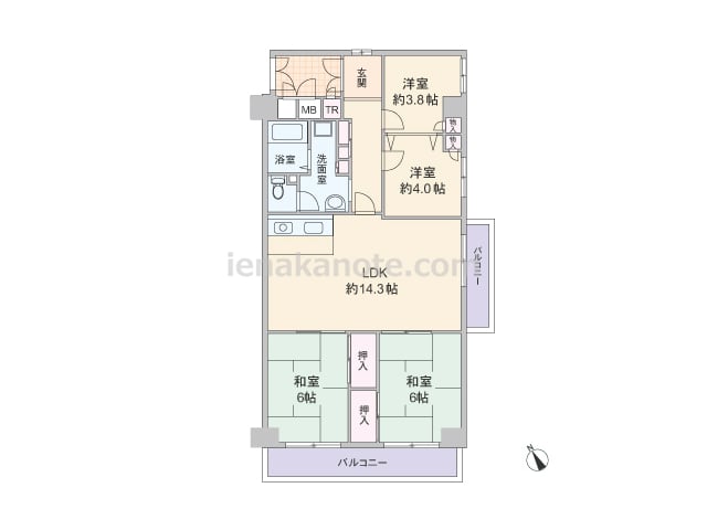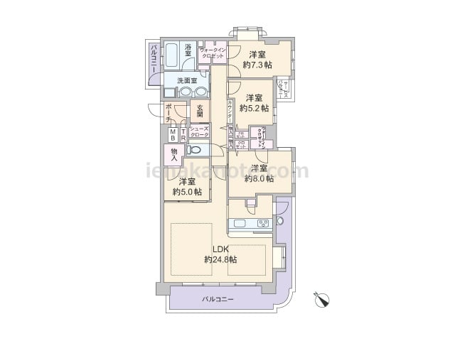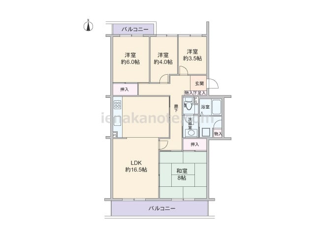 専有面積92.79平米の4LDK。南北両面に窓・バルコニーがあり、玄関から居室が居室が見通せないプラン。LDK約16.5帖は出入り口が2カ所あり、ダイニング・キッチンとリビングスペースを分けて使う事が出来ます。和室8帖も2カ所から出入りで...
