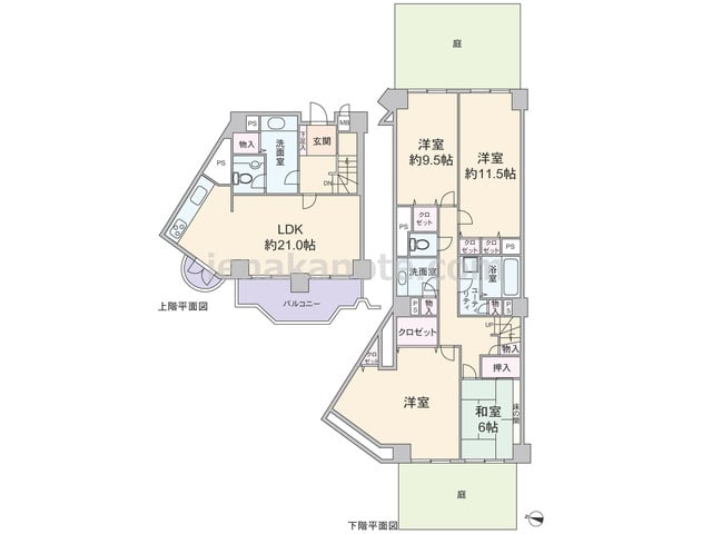 専有面積179.78平米の4LDK。2階に玄関があるメゾネットタイプ。上階はLDKと洗面室、トイレのみ。LDKは約21帖の広さがあり、3カ所に窓付き。キッチンはI型のオープンタイプ。洗面室はゆとりがあり、収納スペース付き。下階の個室はすべ...