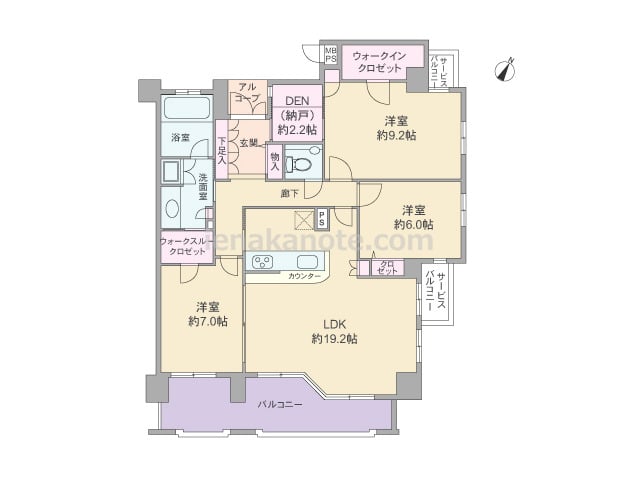 専有面積100.78平米の4LDK。全室6帖以上のゆとりがあるプラン。玄関前にはアルコーブがあり、玄関横には約2.2帖のDEN(納戸)があります。LDK約19.2帖大には明るく・開放感のあるコーナーサッシが用いられ、キッチンは作業をしなが...