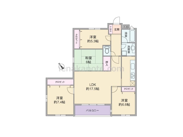 専有面積73.55平米の4DK。居室の窓が共用廊下に面しておらず、玄関から居室を見通せない造りでプライバシーが確保されています。ダイニングスペースを通って各部屋にアクセスする、家族のコミュニケーションの機会が増えるプラン。洋室約5.5帖と...