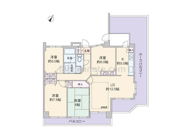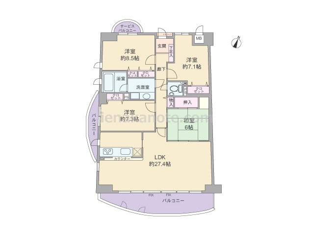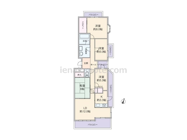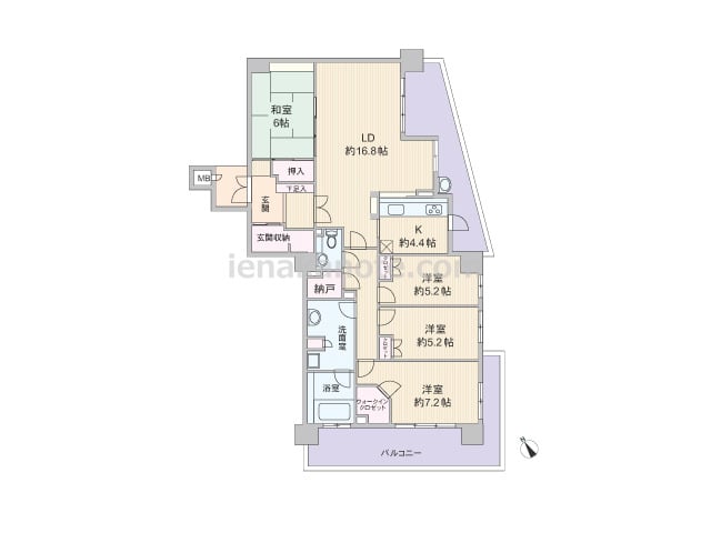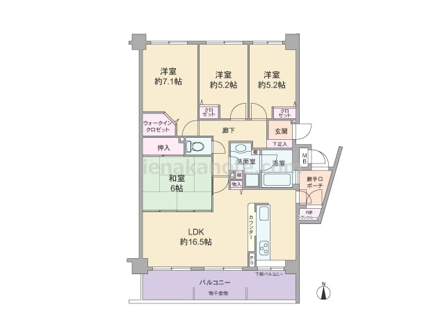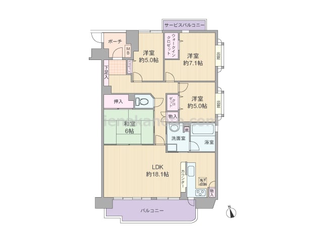 専有面積94.55平米の4LDK。玄関前には専用ポーチ付き。共用廊下に直接面した窓がなく、プライバシーを確保しやすいプラン。合計3カ所にバルコニーがあり、キッチンや浴室、洗面室にも窓があります。各部屋に収納スペース付きで、洋室約7.1帖に...