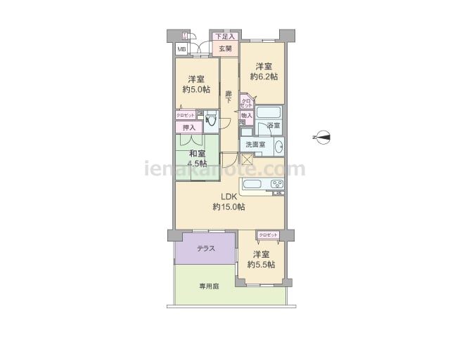 専有面積81.46平米の4LDK。専用庭が付いたプラン。玄関から居室が見通せない、プライバシーに配慮された造りです。LDKは約15.0帖、キッチンは料理をしながら家族とコミュニケーションが取りやすい対面カウンタータイプ。和室4.5帖の襖を...