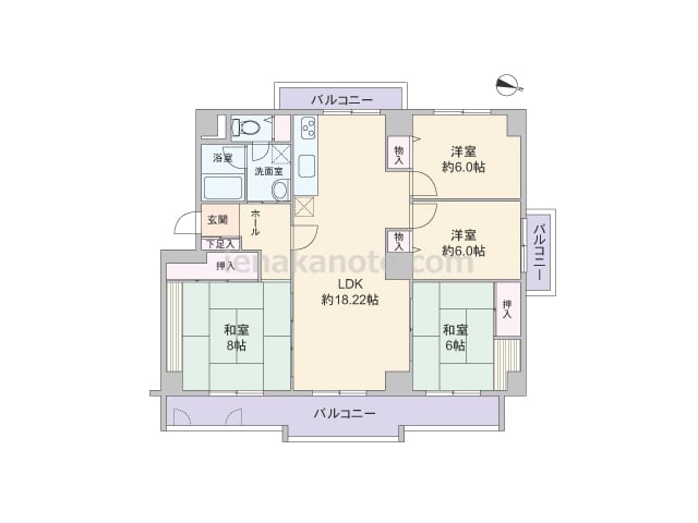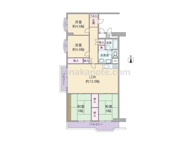 専有面積86.44平米の4LDK。居室の窓が共用廊下に面していない、プライバシーを確保したプラン。LDKは約13.8帖、和室二部屋にはLDKを通ってアクセスします。北側洋室約4.6帖には収納スペースがありませんが、その他の居室と室内廊下に...