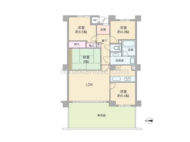 専有面積80.93平米の4LDK。専用庭があるプラン。独立型のキッチンはリビングダイニングから見えにくく、生活感が伝わりにくいのが特徴。和室6帖は2カ所から出入りでき、LDK側の襖を開放すればLDKをより広く使えます。洋室約5.4帖はLD...
