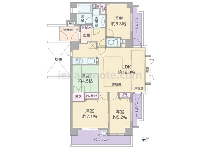 専有面積80.00平米の4LDK。居室の窓が共用廊下に面しておらず、玄関前に専用ポーチがある、プライバシーを確保したプラン。生活感の出やすいキッチンは独立タイプのため、くつろぎの空間を演出可能。和室4.5帖はくつろぎのリビングスペースにぴ...