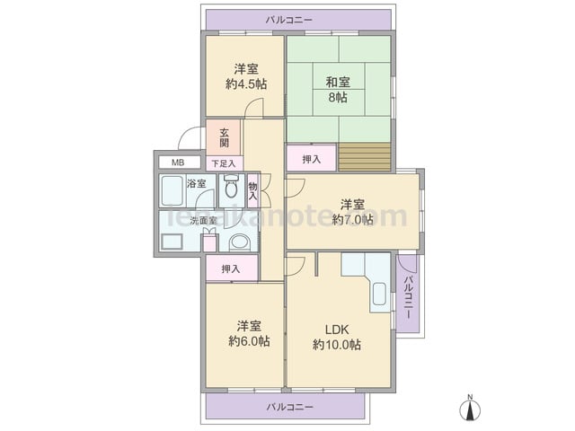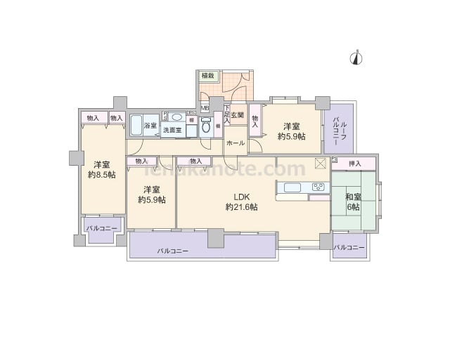 専有面積84.87平米の4LDK。玄関前に専用ポーチ、共用廊下と居室の間に吹き抜けが付いたプライバシー性の高いプラン。室内廊下が短く、居室空間が広く取られています。LDKと和室が続き間で、約23.2帖の一つの空間としても使用可能。洋室5帖...