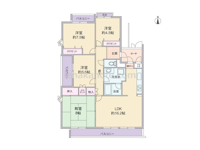 専有面積89.64平米の4LDK。共用廊下に直接面する窓が無く、玄関前に専用ポーチが付いた独立性の高いプラン。LDK約16.9帖にはコーナーサッシが用いられています。和室の引き戸を開放すれば約21.7帖大の空間に利用可能。キッチンはコの字...