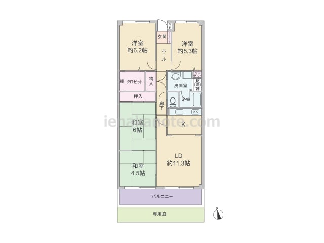 専有面積110.44平米の4LDK。生活感の出やすいキッチンは奥まって配置されているため、リビング・ダイニングはくつろぎの空間を保つ事が出来ます。洋室約6.82帖には収納がありませんが、その他の居室に収納スペース付き。和室の板間は家具を置...