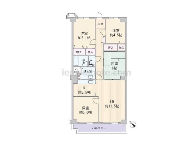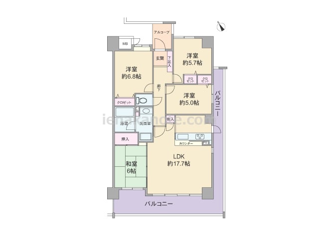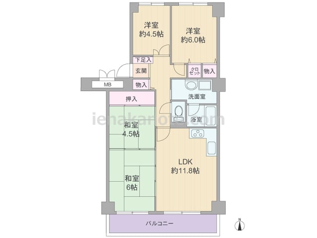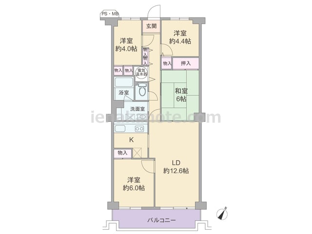 専有面積94.83平米の4LDK。玄関前にプライバシーに配慮されたポーチ付き。キッチンから直接ポーチ、外にアクセスでき、家事動線にすぐれています。LDKと和室が続き間で、一つの空間としても使用可能。各部屋に収納スペース付き。和室と主寝室約...