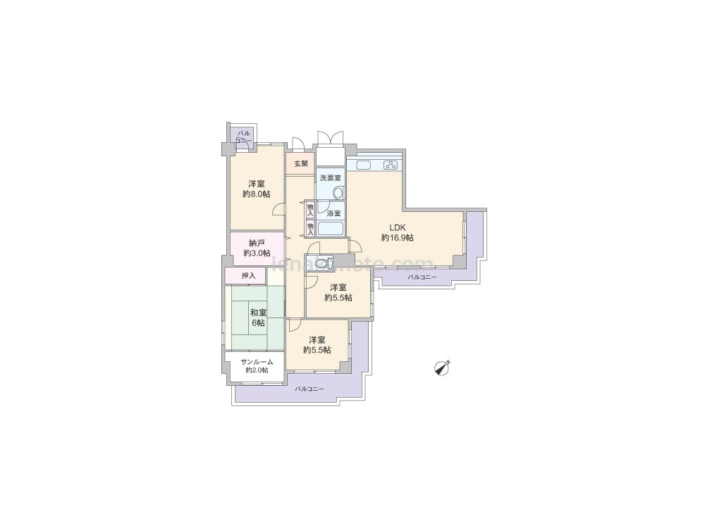 専有面積109.12平米の4SLDK。バルコニーは広々としており、開放的。LDKは16.9帖。各室が独立して配置され、プライバシーが確保されています。約3帖大の納戸があるなど、収納スペースが充実。和室にサンルームが隣接しており、観葉植物置き場や雨の日の洗濯物干し場にもピッタリです。
