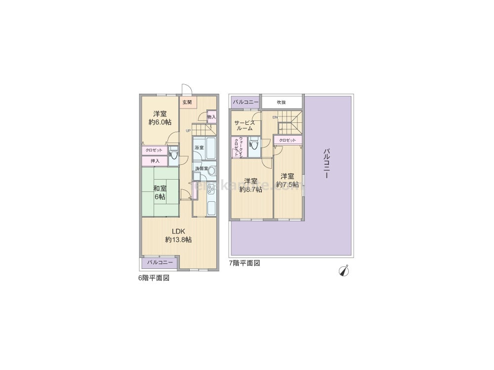 専有面積121.29平米の4SLDK。LDKは13.8帖、キッチンは独立タイプ。リビングと和室は続き間になっており、襖を開ければより広々とリビングを使えます。全室6帖以上で、各室に収納付き。また、収納にも書斎にも使える、サービスルームもあります。最上階の7階にはたいへん広いルーフバルコニーが付いており、ガーデニングを楽しんだり、椅子やテーブルを出してくつろいだり、と様々な用途で空間を楽しめます。