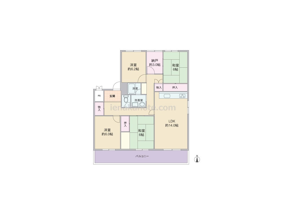 専有面積93.85平米の4SLDK。センターイン、ワイドスパンのプランで、LDKを含む3室が南向き。全部屋6帖以上の広さがあり、北側の和室横に、廊下からも出し入れできる納戸付き。キッチンは壁付けのオープンタイプ。バルコニーは広く、ガーデニングもたっぷり楽しめます。